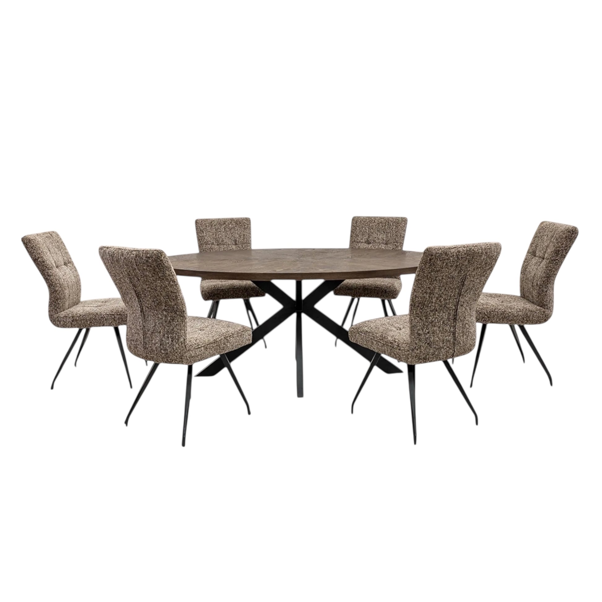 The Sebena dining table features a striking sunburst design which has been meticulously hand crafted and finished in a dark oak stain. This wonderful visual presentation is complimented using an x frame leg base in a black powder coated finish.